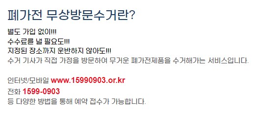 가끔씩 가전제품이 고장 나거나 버려야 할 때 혼자서는 버리기 힘든 순간들이 있습니다. 이때 혼자 고민하지 마시고 폐자전 무상방문 수거 이용해 보시라고 이용방법 알려드리겠습니다. 바쁘신 분들은 바로 예약 접수 하실 수 있도록 버튼 남겨 두겠습니다.