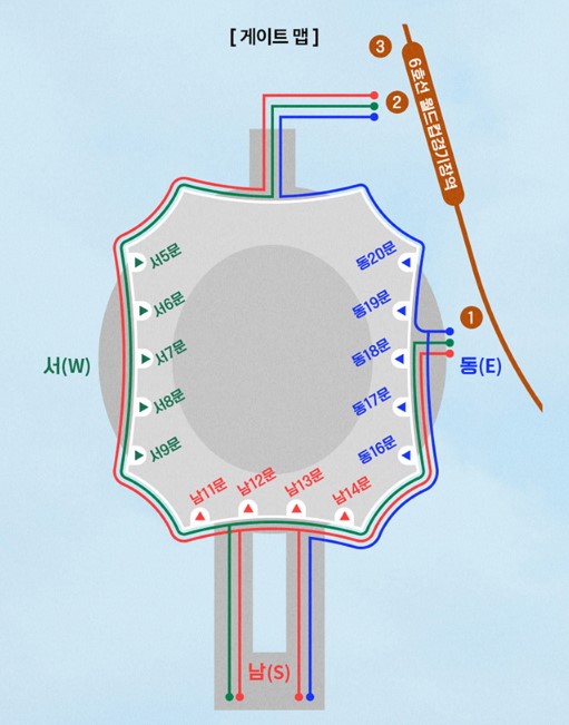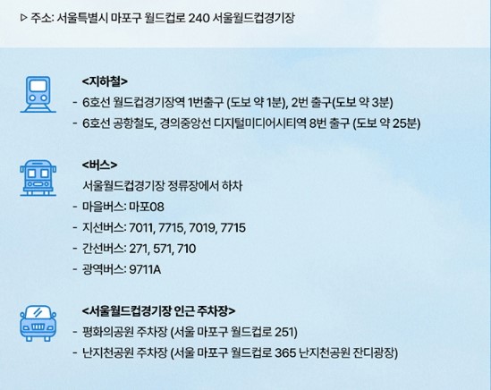 - 상암경기장 2층 예매시 경사가 가파르고 계단 폭이 좁아 고령자, 어린이, 임산부, 환자나 부상자 등 이동에 불편한 분들은 2층 50열부터의 좌석 예매를 삼가해 주시기 바랍니다.